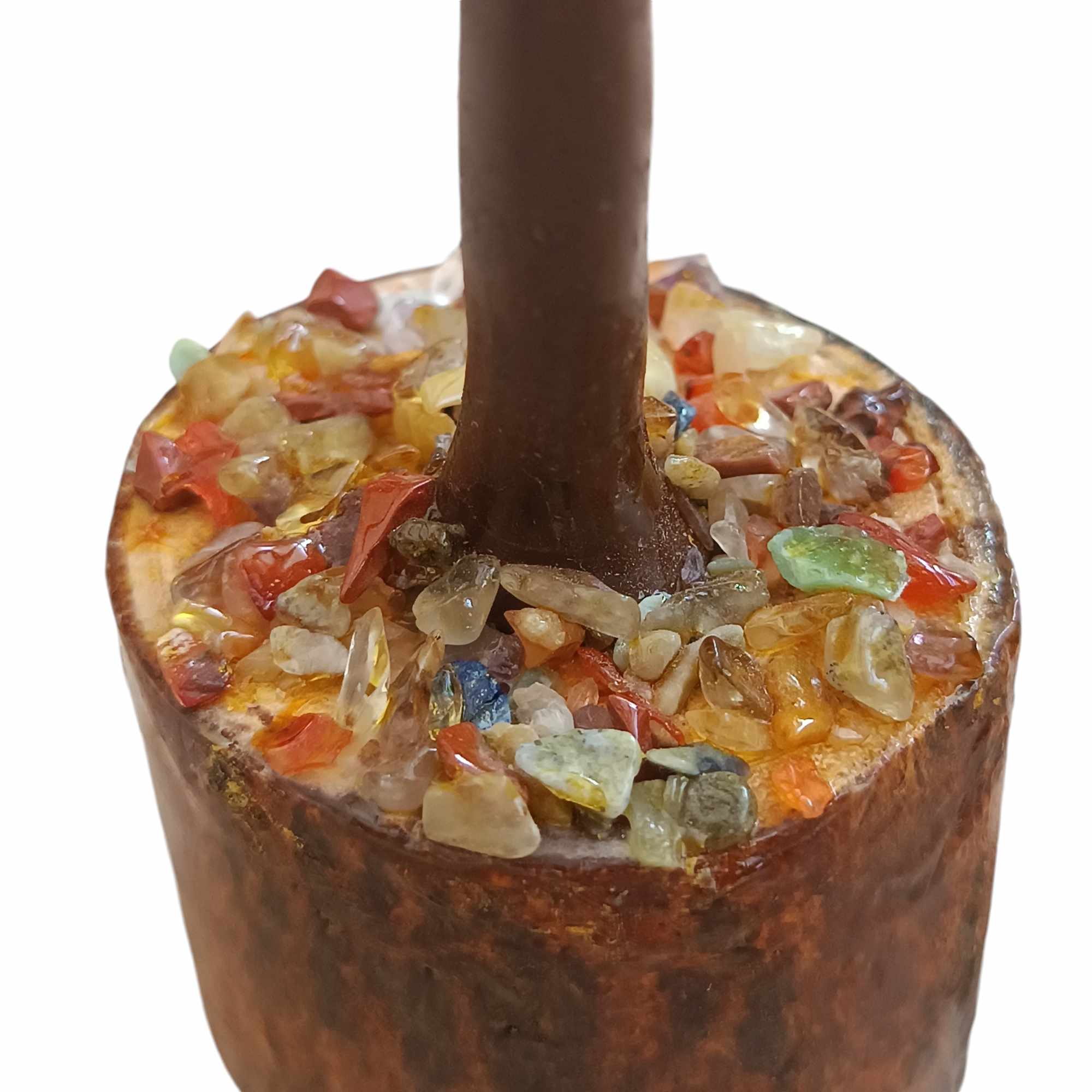 Ses branches sont torsadées à la main. Ses feuilles ? Des pierres semi-précieuses, une couleur par chakra. Il capte la lumière, il capte les regards. Cet arbre représente l’équilibre. Et il est super beau, voilà.